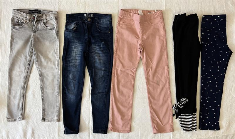 Сині Kids, розм.146, довж.85см, полуобхват 26см. Чорні джинси-9-10 років, довж.75см, пояс на резинці. Сірі джинси Tommy Hilfiget, розм.120-116, довж.65см, полуобхват 26см. Джинси сині Eleysa, 8-9 років, довж.70см, полуобхват 25см. Джинси H&M, розм.122, довж.72см, полуобхват 29см. Лосіни, розм.122- по 20 грн.