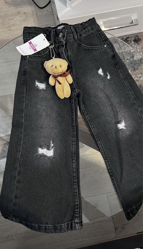 Джинси на дівчинку, дуже гарна якість, плотний джинс темно-сірого кольору, брелок мішка знімається Розмір 4-5р довжина 60см, пояс 25см Турція