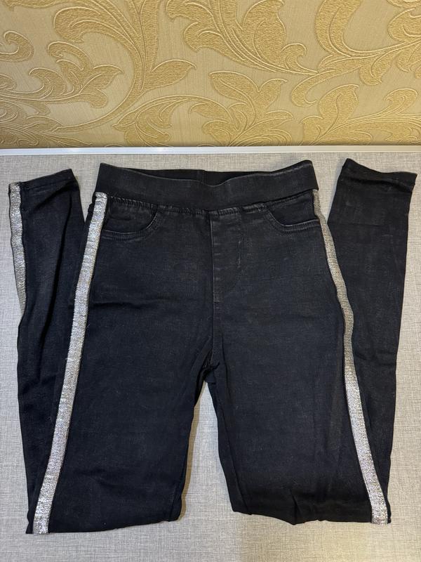 По боках з блискучою смужкою ( лампаси ) Приблизний вік дитини 8 - 9 - 10 років . Длина 82 см. Шаговая длина 60 см В резинке 27 см , еще потянуться до 37 см. В стегнах 32 см