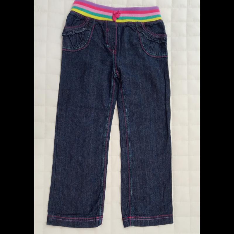 джинсы синие с цветным резиновым поясом с бантиком.прошиты красной и св.зеленой нитками.спереди два кармана с рюшами.ширигка просто контур нитками.сзпди два кармана с вышивками состояние идеальное хлопок 100%> на 5-6 лет.замеры:29- пояс резинка+ до37.*70- длина*16- низ выход