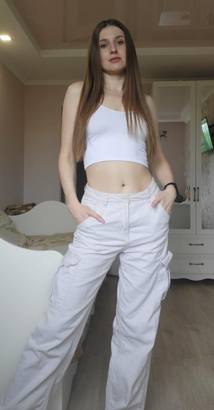 Стильные базовые джинсы карго с накладными карманами бежевого цвета. Средняя посадка, идеально садятся по фигуре, без дефектов. Материал - коттон