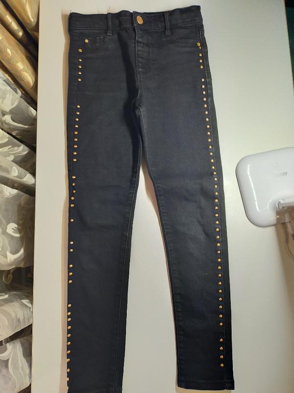 Брюки - джинсы черного цвета на пугвичке. По бокам идут стразы, также есть пуговицы на поясе для регулировки. Рост 134 - 9 лет. Эффект один не все стразы на месте, но при носке оно совсем не видно. По замерам обратитесь.