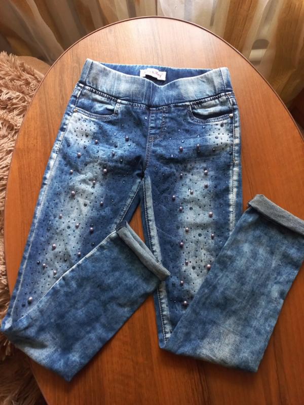 Качественные джинсы,джегенсы.Размер 22. Бусинки и камушки качественно проклеены. Удобные так как пояс резинка, при необходимости тянутся. Состояние без каких-либо дефектов. Отправка в день заказа!