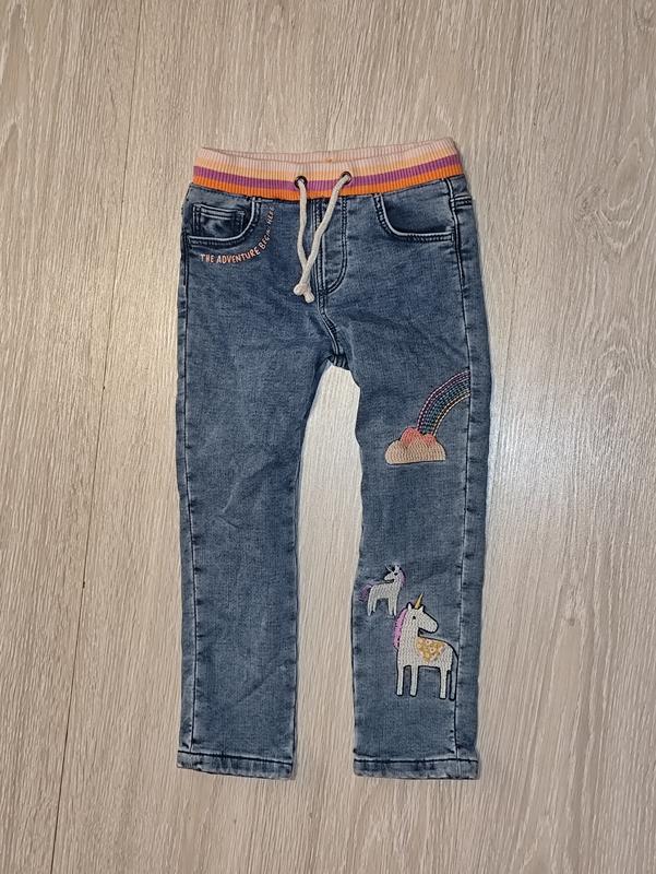 Фирменные джинсы джоггеры на 2-3 года На талии резинка и канатик для регулировки талии, в середине маленькая наческа. Состав ткани 85% хлопок, 14% полиэстер и 1% эластан. Состояние отлично Замеры: длина 60 см, шаговый шов 41,5 см, талия 26 см, попа 31,5 см, посадка 18,5/23,5 см, ширина штанины у матни 18,5 см, ширина штанины внизу 12 см