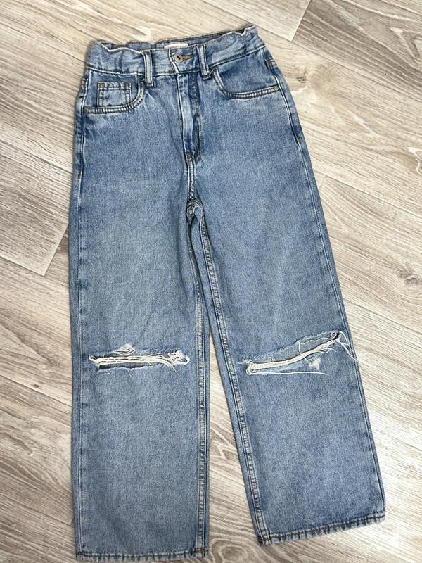 Джинсы свободного кроя с дырками на коленях. В талии есть утяжка Состояние супер 9 лет/134 Длина 80. Шаг 56. Пот 26+
