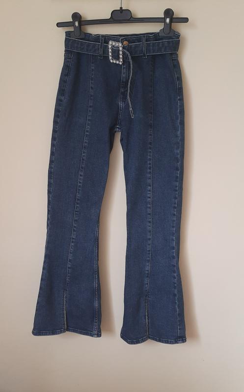 Джинсы клеш. На 12 лет. 152см. Фирма Riverp lsland. Made in Bangladesh. Брючины снизу, спереди имеют распорки, которые декорированы лентой с камушками. Застежка- металлический замок на пуговицу заклепку. Пояс -на резинке, по бокам есть резущая резинка на пуговицы. Есть вставной пояс с декоративной пряжкой. Стрейчевые, хорошо тянутся. 99% котон, 1% еластан. Состояние очень хорошее, только на кишенке сзади есть маленький разрыв, который зашит. Замеры: Пол объема талии 31/34см в растяжение. Пол объема бедер 42см Длина по внутреннему шву 90см Длина по внутреннему шву 70см Глубина посадки спереди 25см от соединения швов Глубина посадки сзади 29см от соединения швов Ширина штанины вверху 22см Ширина штанины в колене 18см