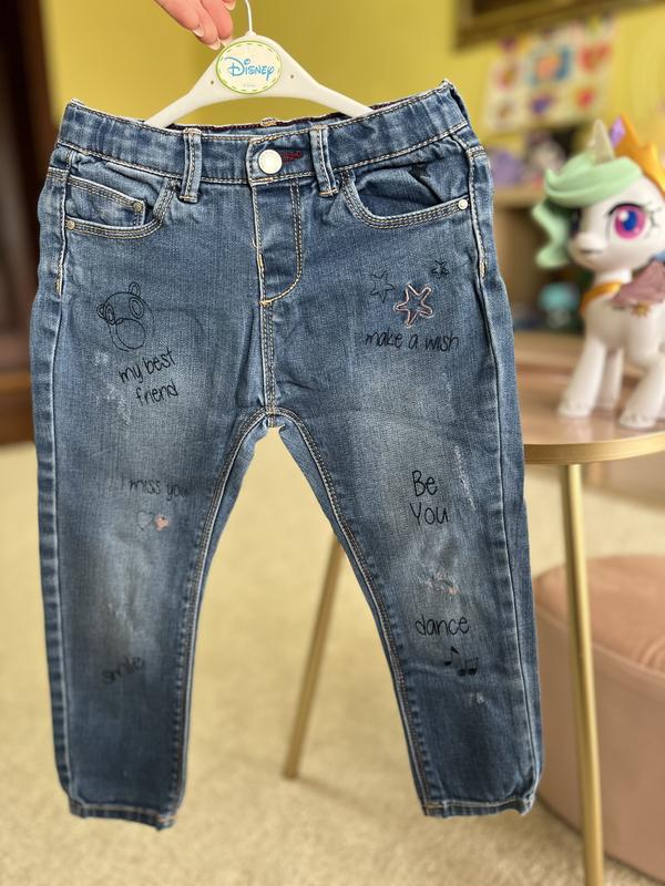 Джинсы с принтом от фирмы Zara, размер 98см, но могут быть и быстрее, и дольше, потому что их можно подкачивать, внутри они бордового оттенка. В хорошем состоянии