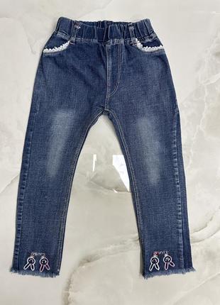 Милые штанишки в отличном состоянии. На талии резинка, карманы украшены рюшами. Джинс тянется. Бирки все срезаны,подойдут на 4-5 лет, ориентируйтесь по замерам на фото.