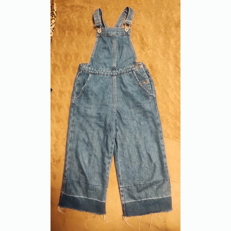 Джинсовый комбинезон с брюками кюлотами. По бирке 8 лет, но маломерит, одевали на 7. Зависит от ребенка. Тканина не тягнеться.