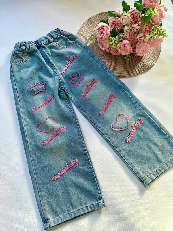Очень крутые джинсы палаццо для девочек Пояс на резинке Красива нашивка Замеры 120-Длина 69 см шаг 43 см талия 22*2 см 130-Длина 72 см шаг 45 см талия 22*2 см 140-Длина 76 см шаг 49 см талия 23*2 см 150-Длина 82 см шаг 52 см талия 24*2 см 160-Длина 87 см шаг 57 см талия 24*2 см