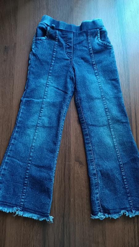 Стильные джинсы с клешным низом.Мягенький джинсы, красиво тянутся,круто смотрят на ребенке.Идеальное состояние.Размер 4-5 лет.Пояс на резинке, без пуговиц и замков, для маленького ребенка идеально.Замеры на последних фото.