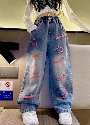 🦄Стильная новинка. Джинсы палаццо для девушек. Цвет - голубой, надпись - вышивка, в поясе хорошо тянется. Стильные и удобные. 🦄Размеры: 140-3 шт. 150-5 шт. 160-5 шт. 170-5 шт. 🦄Замеры: 140-Длина 79, крок 52,пояс 21 см. 150-Длина 84,шаг 57,пояс 23 см. 160-Длина 91,шаг 63,пояс 24 см. 170-Длина 99, крок 66,пояс 25 см. Ориентация на замеры, допускается погрешность в 1-2 см. Цена:770 грн.