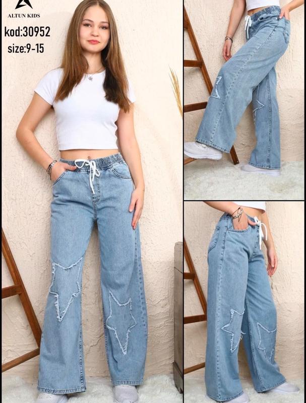 🎀 НОВИНКА 🎀 Джинси палацо для красунь 💗 Пояс широкая резинка + рабочий шнурок, есть карманы Украшены нашивкой Тканина плотний джинс, не тягнеться ЗАМЕРЫ: длина/шак/пояс/бедра 9 - 83/56/27/43 10 - 86/59/27/45 14 - 99/71/30/52 РАЗМЕРЫ: 9 (134) - 1 10 (140) - 1 14 (164) - 1 Арт саш