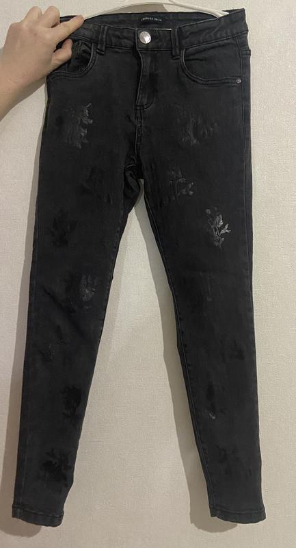 Продам джинсы на девочку Черные ( интересный узор: скрытые блестящие листочки ) 146 размер, длина 86 см