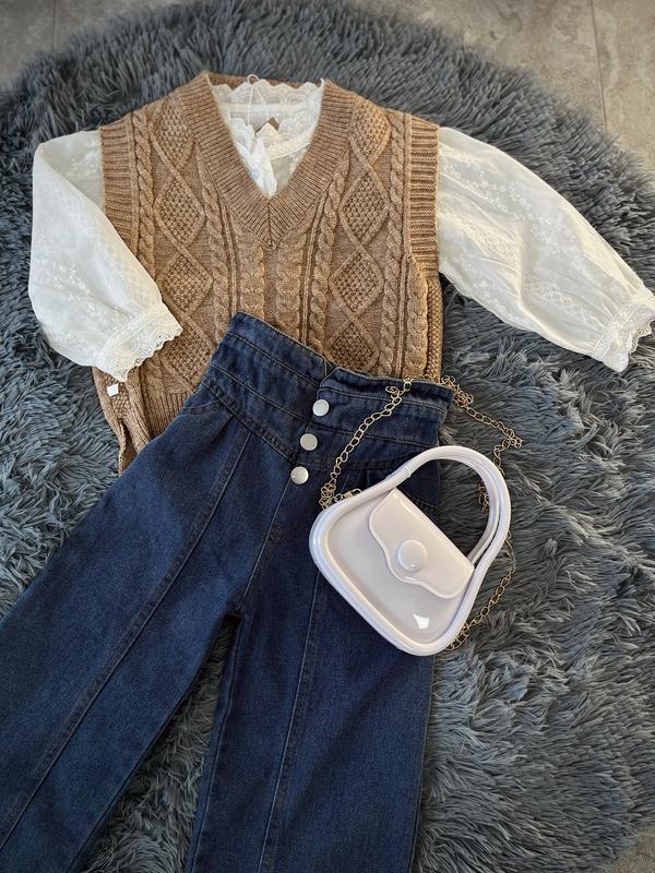 ✨Стильний образ для дівчинки: елегантна блузка з ніжним мереживом , доповнена зручним і теплим жилетом, і класичні джинси, що підходять для будь-якої прогулянки. ✨Ціна: ✨Джинси: 750 грн (110,120,130) ✨Жилетка: 500 грн (80,90,100,110) ✨Лакована сумочка: 600 грн