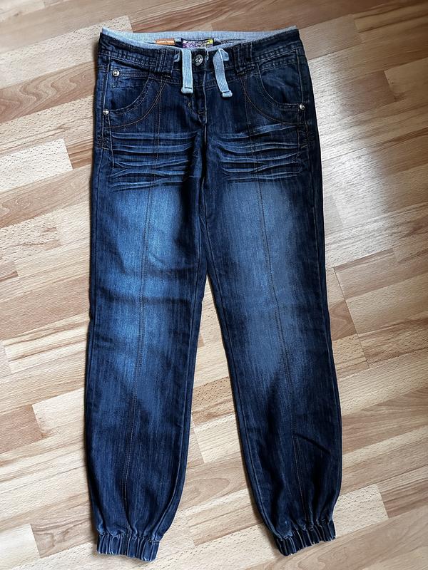 Cuff Jean. Размер 12-13. Длина 92 см, шаг 71 см, пот 38 см (шнурочки декоративные, не затягиваются). Поб 44-45 см. Снизу, где манжеты, местами протерто, где собирается резинка.