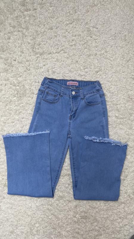 Джинсы для девочки, красивого голубого цвета (фото темнит), прямой пошив, необработанный низ. Фото замеров добавила.