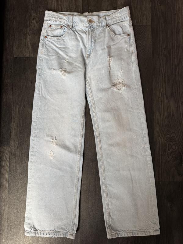 Стильні джинси Zara,розмір вказано 164.Маломірять.Є утяжка на поясі. Пояс 36 см,бедра 45 см,Довжина по зовнішньому шву від пояса 86 см,внутрішньому 64 см.Ширина штанки внизу 20 см.Тканина не тягнеться.