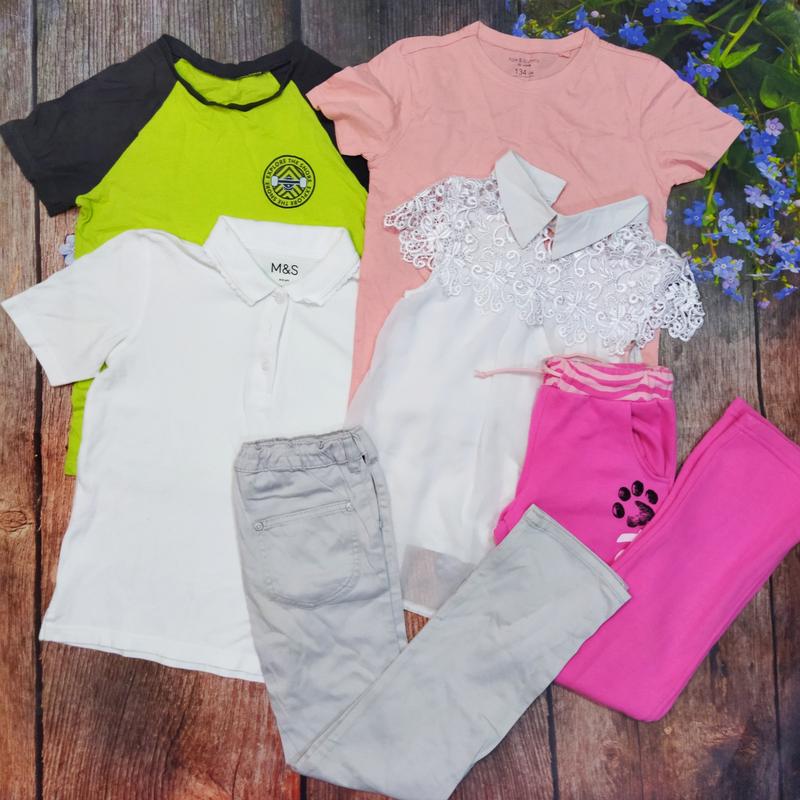 Набор вещей для девочки 8-9 лет Состояние вещей отличный В набор входит: Брюки- GeeJay Штани спорт- Gloria Jeans Блузка Футболка - Sinsay Футболка - George Футболка -M&S