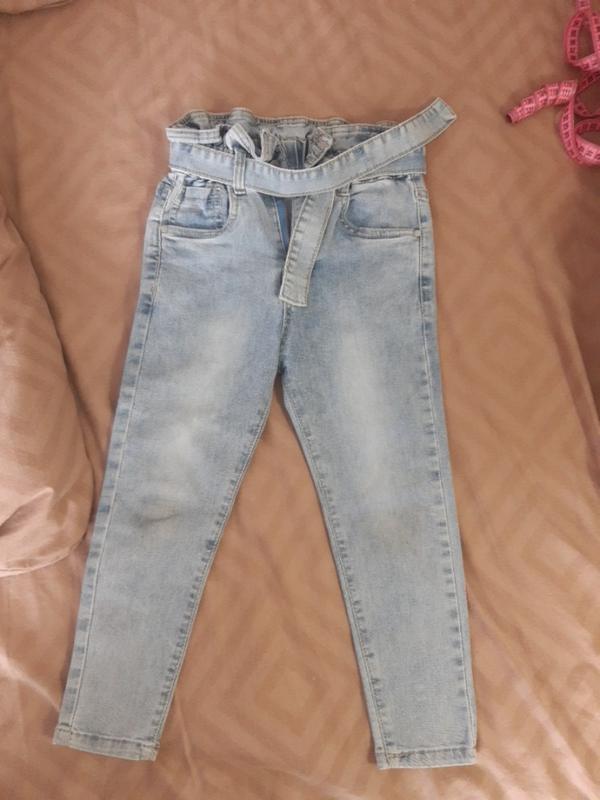джинсы для девочки на 5-6 лет длина 68 см, в поясе 28, недостаток нет заклепки одной