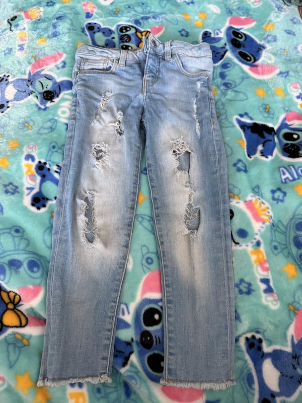 Джинсы скинни, рваные. На поясе есть регулировка размера(видно на фото). Материал тянется
