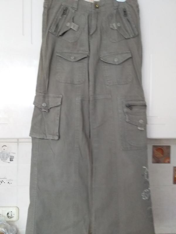 Джинсы, цвет хаки, украшенные различными карманами с пуговицами и кнопками и вышивкой, 97% коттон, 3% спандекс, пояс 35см, бедра 48см, длина 101см, в ходу 80см ширина штанины в колене 22см, внизу 25см
