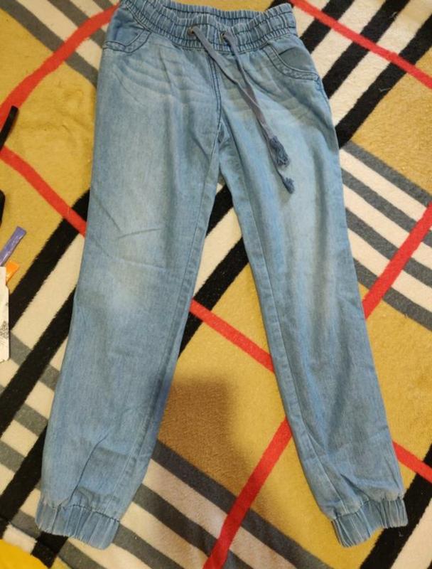 Голубые джинсовые джоггеры на резинке Не стрейчевые 32-34 по талии в спокойном состоянии до 39 тянутся в талии (поэтому должны так пройти по бёдрам) 46 бедра 21 посадка 69 по шаговому На подростка или xs xxs petite 152 см рост 11-12рр