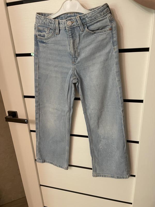 Блакитні палаццо Розмір по бірці 6-7 р , 122 см Стан відмінний, мають утяжку Єдиний недолік - нерівномірно зафарбована ліва штанина - враховано в ціні