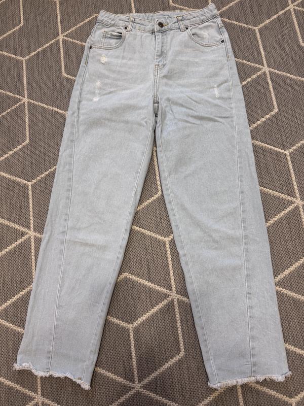 Блакитні прямі джинси з необробленим низом, регулятор на поясі, стан ідеальний, надам заміри