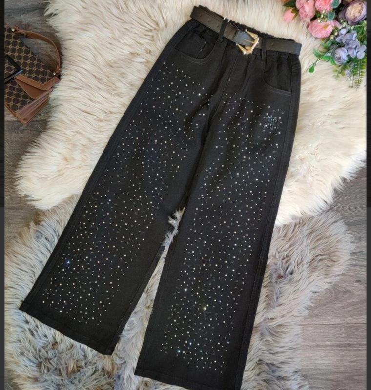 Шикарні джинси палаццо якість супер пояс в комплект не йде декоровані камінцями пояс на резинці заміри-довжина\крос\стегна\пояс 140(28)-92\64\49\27 146(29)-95\66\50\27 152(30)-97\69\50\28 158(31)-99\72\52\28 164(32)-102\74\53\29 Мд