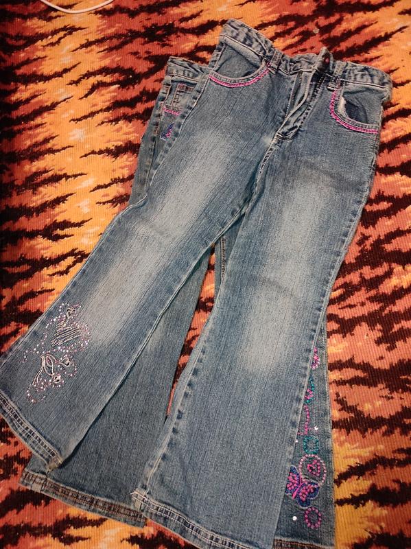 джинсы для девочки 2 штуки возраст 6-7 лет замеры пояс 27 длина 70 бедра 32 посадка 23 перед 25 посадка сзади на одних верхних выскочила кнопка (нижняя)