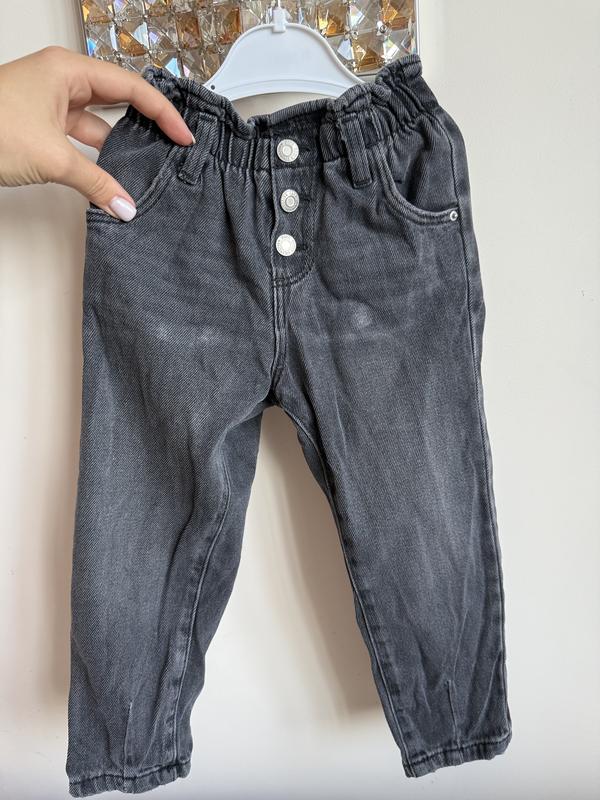 Дитячі чорні джинси в розмірі 104, на поясі ідуть рюшками, резинка тягнеться добре, донизу заужені