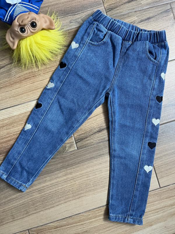 Джинси у ідеальному стані, по бокам вишиті сердечка, темно синього кольору. Довжина - 55 см Талія полуобхват - 24 см розтягується до 30 см Внутрішній шов - 36 см