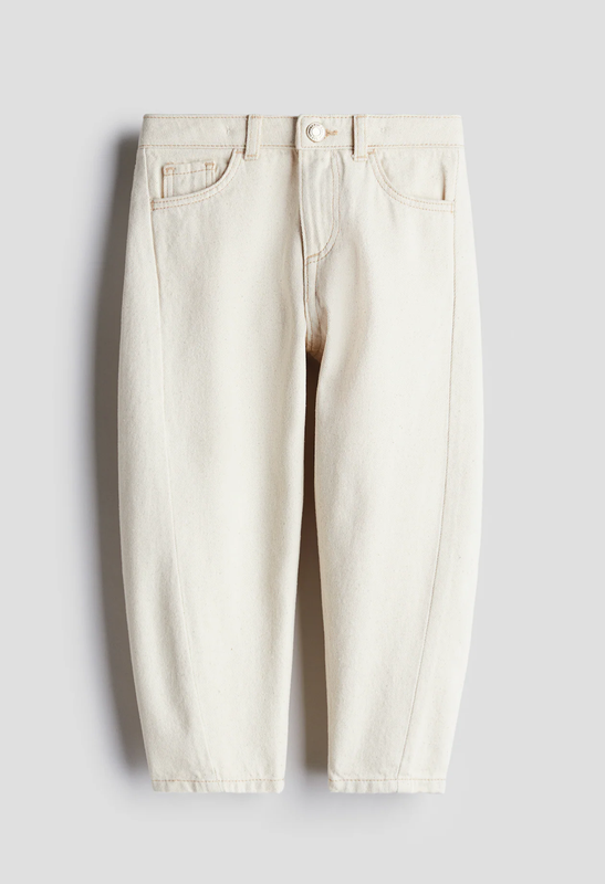 100% бавовна, джинс не тягнеться. Цвет не белый, кремовый. Седают свободно, объемно по фигуре. Есть регулировка в талии. Размер 8-9 лет/134 см, замеры: Длина по боковому шву 79,5 см Шаговый 55 см Ширина по поясу 28 см Стегна 44 см