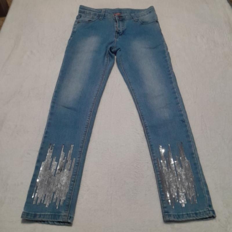 Джинсы с блестками Tissaia стрейчевые, тянутся. размер 134-140 довжина по зовн. шву 80 см, по внутр. 60 см ширина в поясе 31 см (в поясе есть утяжка) ширина в стегнах 36,5 см посадка спереду 20 см, ззаду 27,5 см.