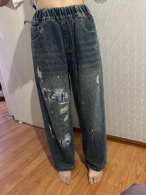Джинси на дівчинку в ідеальному стані, широкі, пояс на резинці , є дві кишені спереду та дві ззаду. Мають потертості на написи спереду , на дівчинку 10-11 років. Заміри якщо потрібно відправлю