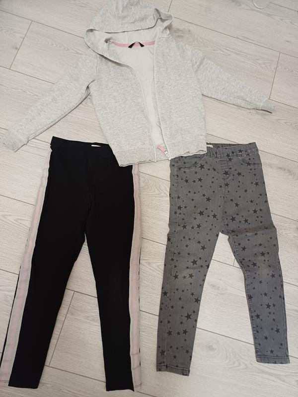 Толстовка на флисе, джинсы серые и лосины черные с полоской. состояние идеально.