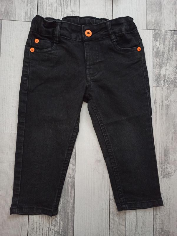Файные джинсы на возраст 2-3 года🖤 Цупкий котон👌 Пояс регулируется резинкой с пуговицами. Насыщенный черный цвет с яркой фурнитурой неон оранжевый 🧡 унисекс👌 Стан-идеал 📏Замеры: длина-47см крок -29см пояс-26см