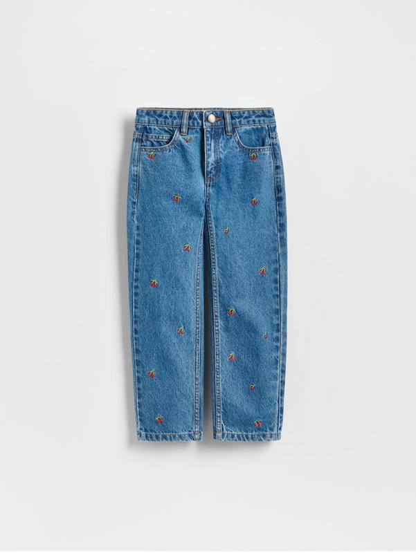 Джинсы прямого кроя, темно синего цвета с аппликацией вишенек. Без нюансов, состояние новых.
