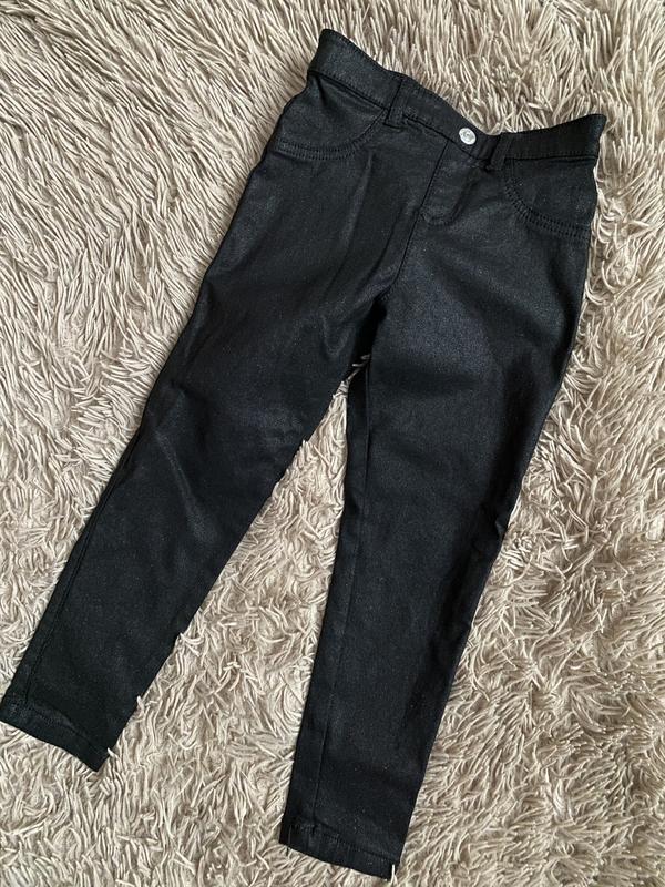 Еластичні джегінси F&F на дівчинку 4-5років, чорні з не дуже вираженими блискітками, без застібки. Склад 76 % віскоза 21% нейлон 3% еластан ПОт 26 см(потягуються до 30см) ПОб 30 см(37см) Довжина 58 см/ 43 см внутрішня Посадка 19/23 см