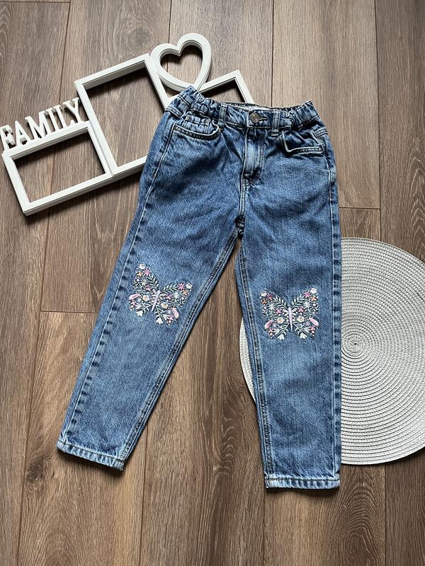 Джинси з вишивкою на 5-6 років 🥰 Довжина 64 см Ширина 25 см ( є утяжка) Крок 45 см Стан дуже гарний ( є ледь помітний дефект на фото)