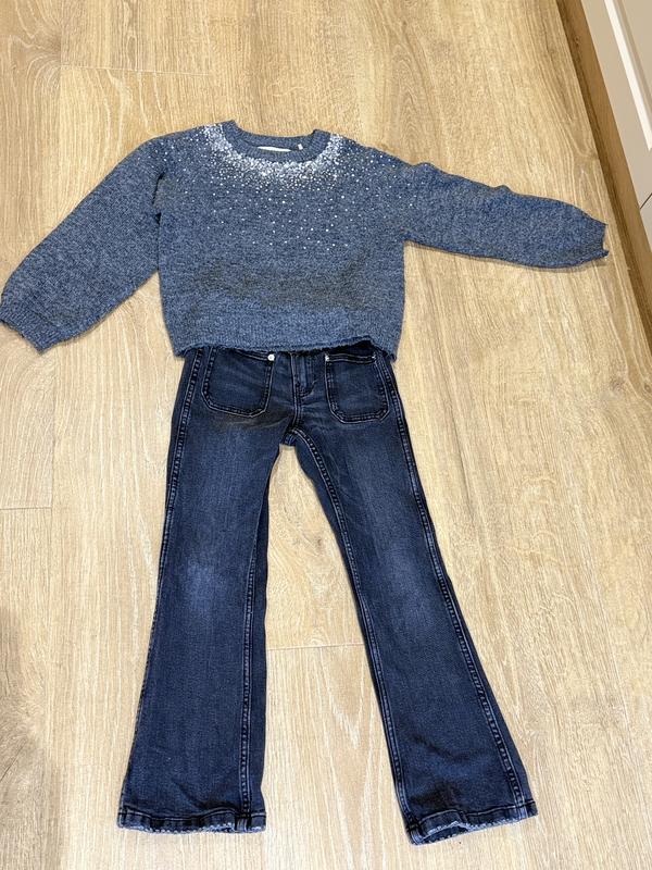 Джинсы для девочки графитового цвета, без потертостей в красивом состоянии.. Внизу легкий клеш. На поясі резинка. Носилы при росте 122.