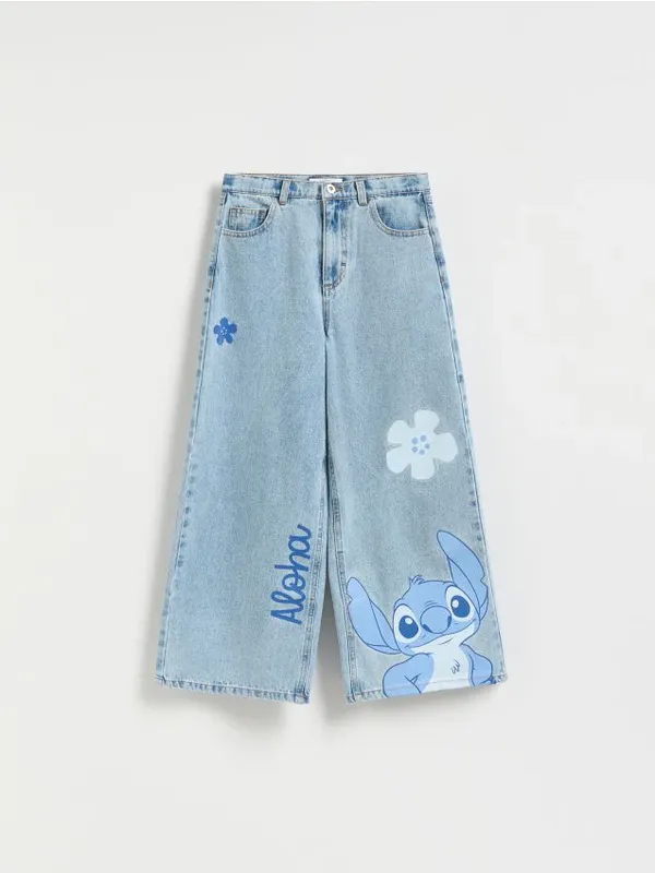 749CV-50J Джинсы с широкими штанинами super wide leg из хлопка. регулировка в поясе на резинку и пуговицу застежка на пуговицы и молнию пять карманов принт Lilo і Stitch длинные широкие штанины ©Disney