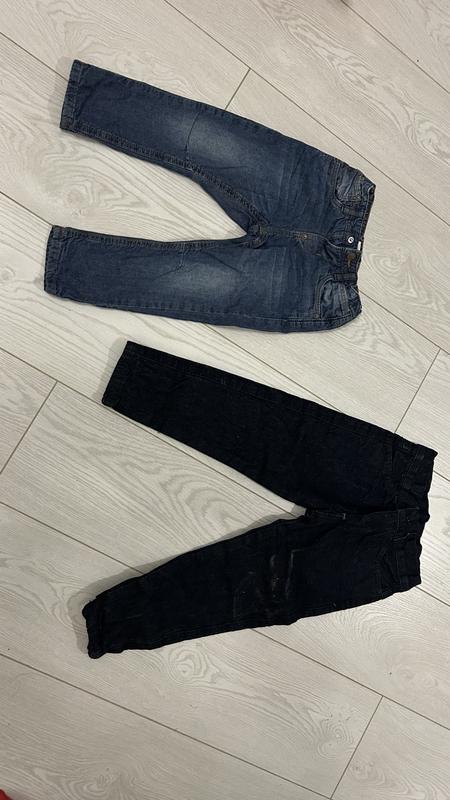 В лоте 2 пары джинсов,детские,на возраст 2-3 года В талии 25 см,полуобьем Темно синие новые Длина 57 см Светлые на трикотажной подкладке Длина 52 см,в поясе 25 и резиночки по бокам