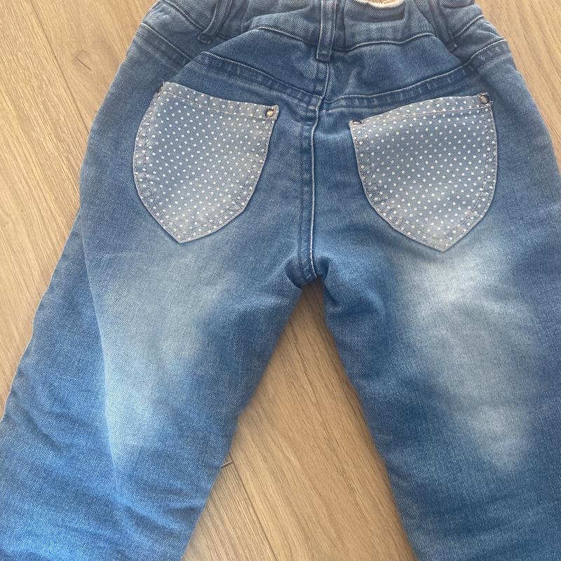 Джинси блакитні утеплені флісом по всій довжині, на блискавці та кнопці, бо бокам з внутрішньої сторони є утяжки, розмір 122 при потребі зроблю заміри.