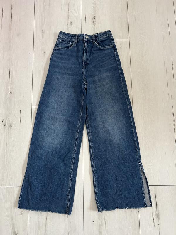 Джинси в ідеальному стані. Широкі, з розрізами по боках. Розмір 164. Заміри: Довжина по внутрішньому шву-100 Довжина по зовнішньому шву-69 Пояс-32 (є утяжка)
