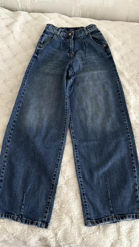 Джинси широкого крою у розмірі 32, кольору синього з потертостями Якісні, стан нового, ідеальний, без пошкоджень, Талія- 62см, позаду в поясі регулюється за допомогою вшитої резинки . Довжина по внутрішньому шву-74см Висота посадки-30см Ширина стегна-58см Ширина штаніни знизу -44см