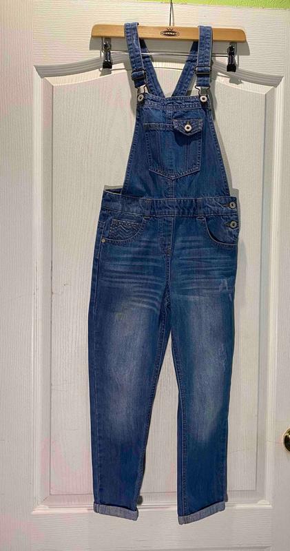 Джинсовый комбинезон для девочки на рост 122-128см. Тёмный деним. Без дефектов (потёртости были изначально). Джинс не тянется. Параметры: Пот - 33см Поб - 38см Длина штанины - 75см Длина верха - 24см Длина петельки - 35см