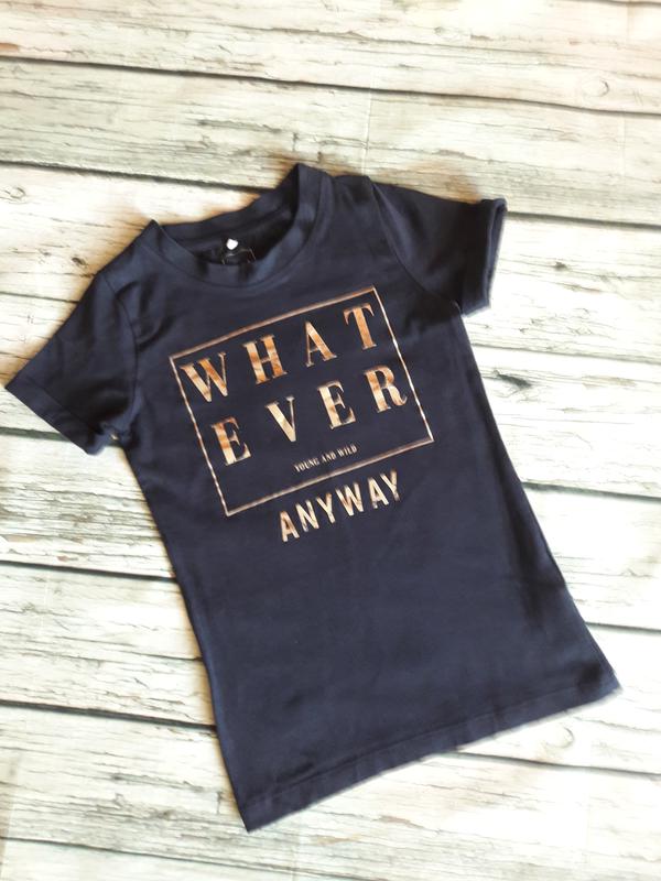 Футболка для дівчинки темно-синього кольору, попереду аплікація, рукав на монжете. Довжина виробу 47см, довжина рукава 13 см, напівобхват грудей 31см.