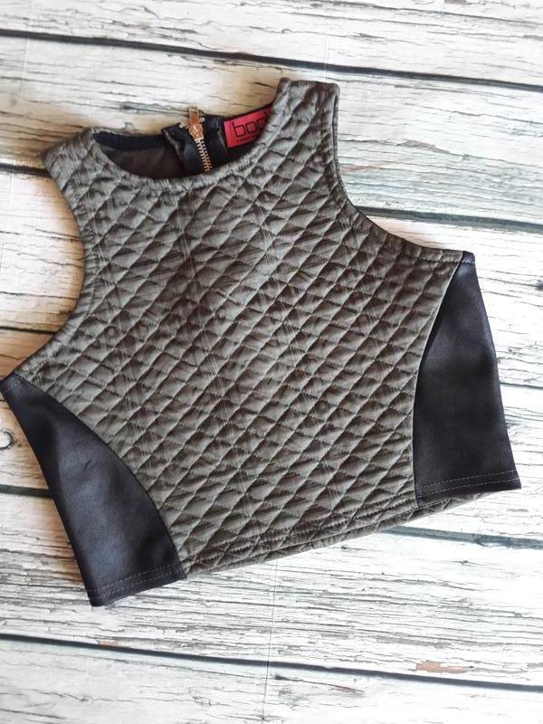 Топ для девочки стеганый, цвет хаки) по бокам чёрные вставки под кожу,застежка на молнии ззади. Длина изделия 33см, полуобхват груди 36см.